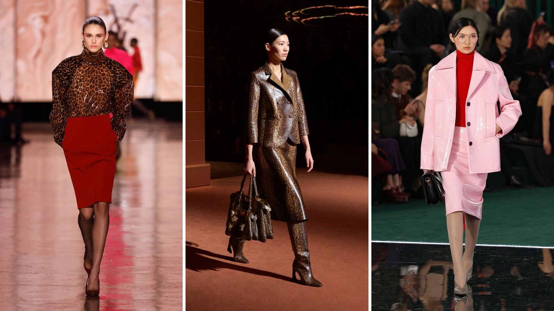 Но юбка-карандаш появилась не только в офисных образах — она уверенно вышла и на вечерние подиумы. Ermanno Scervino и Carolina Herrera показали кружевные и украшенные варианты, а Saint Laurent представил яркие модели с контрастными рубашками.